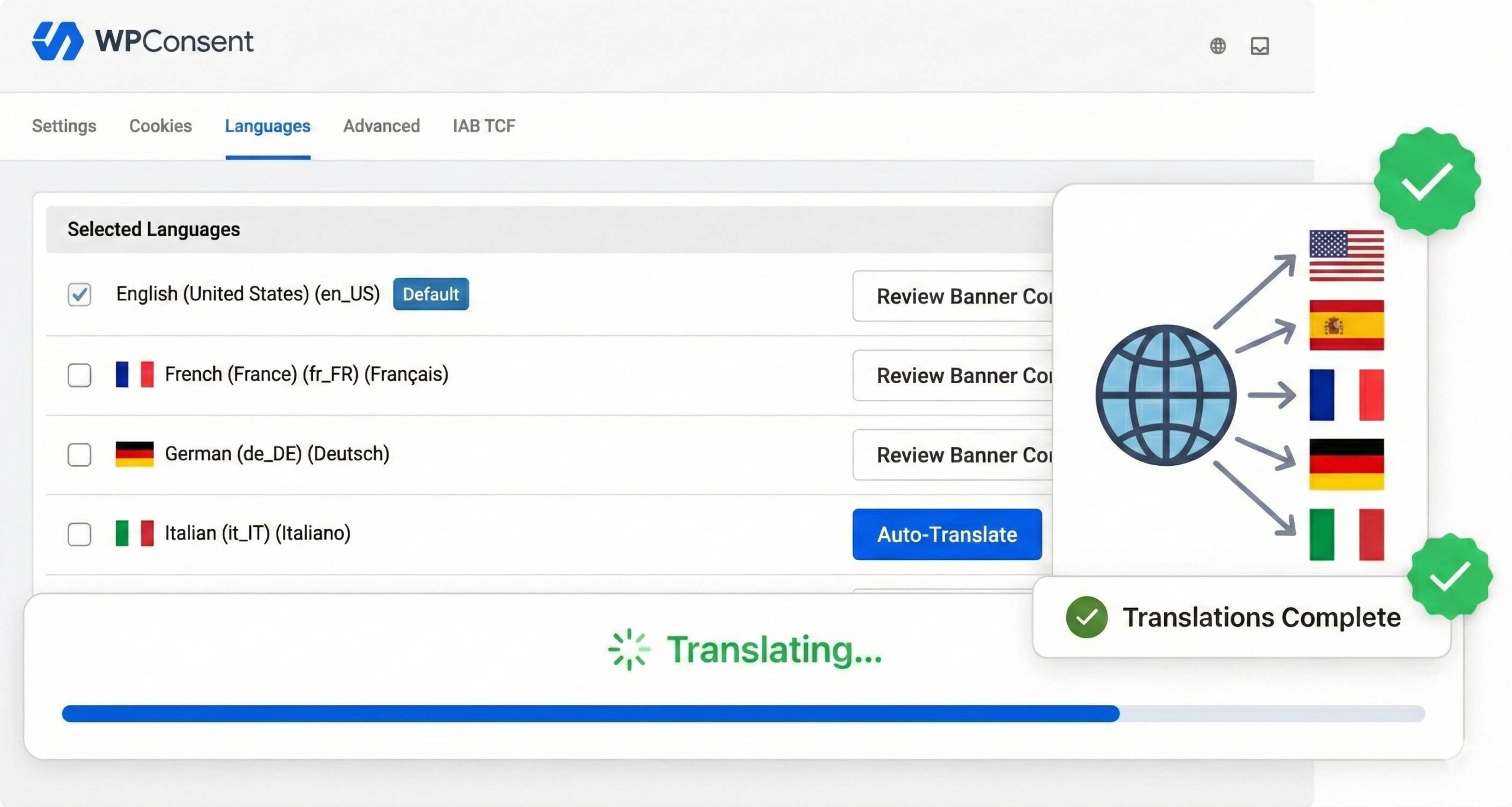 GDPR mandates that consent requests be "clearly distinguishable" and use "clear and plain language." Showing English consent text to French visitors doesn't meet this standard. WPConsent's automatic translations ensure every visitor understands their choices.